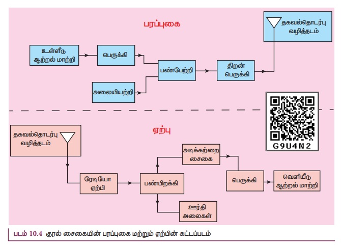 சைகைகளாக மாற்றி, ஏற்பிக்கு அளிக்கப்படுகிறது. ஏற்பியானது பண்பிறக்கி, பெருக்கி, பகுப்பான்