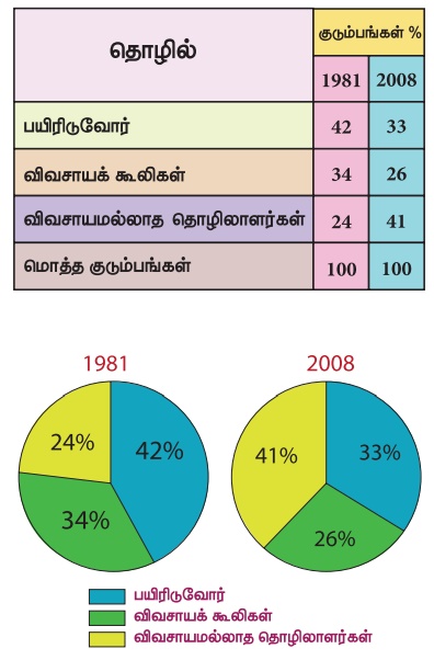 3. உங்கள் பகுதியிலுள்ள 20 குடும்பங்களின் முதன்மைத் தொழில் விவரங்களைச் சேகரியுங்கள். மேலே இருப்பதைப் போன்று ஓர் அட்டவணை தயார் செய்து வகுப்பில் விவாதியுங்கள்