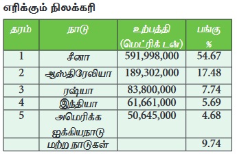 இது உலக ஆற்றல் தேவையில் 25 சதவீத பங்களிப்பை வழங்குகிறது. நிலக்கரி பல்வேறு நோக்கங்களுக்காக