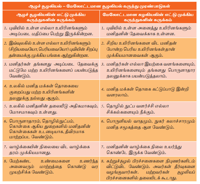 மனிதனுக்கும், சூழலுக்கும், வளர்ச்சிக்கும், சூழ்நிலைக்கும் இடையில் உள்ள தொடர்புகளைப் பற்றி விரிவான விவாதம் உள்ளது. ஆழச் சூழலியல் - மேலோட்டமான சூழலியல் என்ற விவாதம் உள்ளது.