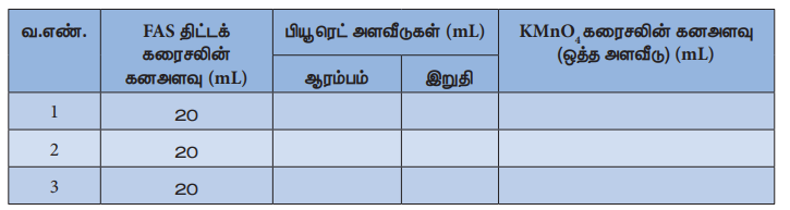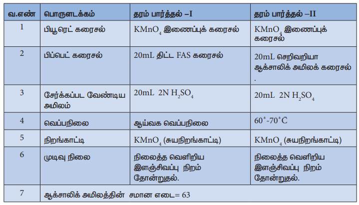 பியூ ரெட்டை நீரினால் நன்கு கழுவ வேண்டும். பின்னர் தரம் பார்த்தலுக்கென கொடுக்கப்பட்டுள்ள KMnO4 இணைப்புக் கரைசலில் சிறிதளவு, பியூரெட்டில் எடுத்துக் கொண்டு அக்கரைசல் பியூரெட் முழுமையும் படுமாறு சுழற்றிக் கழுவுதல் வேண்டும். இதன் பிறகு, கொடுக்கப்பட்டுள்ள KMnO4 கரைசலைக் கொண்டு பியூ ரெட்டில் பூஜ்ஜியக் குறியீட்டு அளவு வரை நிரப்புக. மிகச்சரியாக 20mL திட்ட FAS கரைசலை பிப்பெட்டைக் கொண்டு உறிஞ்சி எடுத்து நன்கு கழுவப்பட்ட கூம்புக் குடுவையில் இடுக. மேலும் இதனுடன் 20mL 2N நீர்த்த கந்தக அமிலத்தைச் சேர்க்க. இக்கரைசலை பியூ ரெட்டில் எடுத்துக் கொள்ளப்பட்ட KMnO4 கரைசலுடன்தரம் பார்க்க. தரம் பார்த்தலின் போதுவினை நிகழ்வதால் சேர்க்கப்படும் KMnO4 ன் நிறம் மறையும். ஆக்சிஜனேற்ற ஒடுக்க வினை நிறைவடையும் நிலையில் சேர்க்கப்படும் KMnO4, வினை ஏதும் புரியாமல் கரைசலில் அப்படியே இருப்பதால் வெளிறிய இளஞ்சிவப்பு நிறம் தோன்றும். இதுவே முடிவு நிலையாகும். இந்நிலையில் பியூரெட் அளவீட்டினை அட்டவணையில் குறித்து கொள்க. ஒத்த தரம் பார்த்தல் அளவீடுகளைப் பெறும் வரையில் தரம் பார்த்தலை மீளவும் நிகழ்த்தவும்.