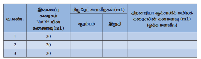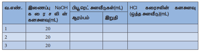 NaOH இணைப்புக் கரைசலின் கன அளவு (V2) = ------ 20 –-------------mL