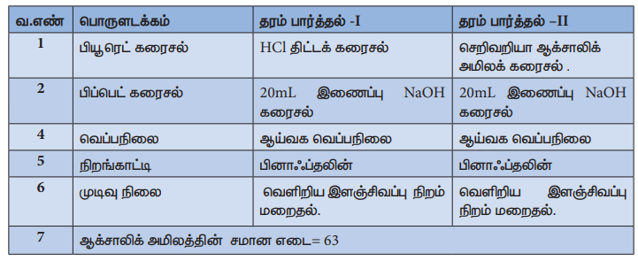 பருமனறி பகுப்பாய்வின் மூலம் கொடுக்கப்பட்டுள்ள செறிவறியா ஆக்சாலிக் அமிலக் கரைசலில் 1250mLல் கரைந்துள்ள படிக ஆக்சாலிக் அமிலத்தின் நிறையினைத் தீர்மானித்தல். இதற்கென, 0.1010N திறனுடைய திட்ட HC1 கரைசல் மற்றும் சோடியம் ஹைடிராக்சைடு இணைப்புக் கரைசல் ஆகியன கொடுக்கப்பட்டுள்ளன.