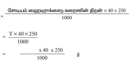 250 mL கரைசலில் கரைந்துள்ள படிக சோடியம் ஹைடிராக்சைடின் நிறை = சோடியம் நிறை ஹைடிராக்சைடு திறன் × 40 × 250 / 1000
