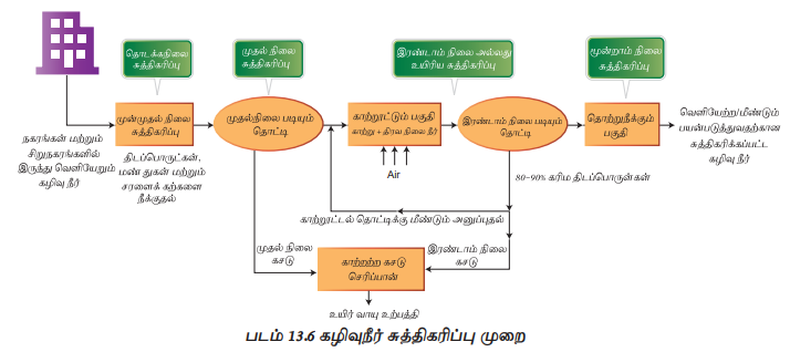 கீழ்க்காணும் மூன்று நிலைகளில் கழிவுநீர் சுத்திகரிப்பு மேற்கொள்ளப்படுகிறது (படம் 13.6).