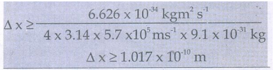 2. ஒரு எலக்ட்ரானின் திசை வேகத்தை அளவிடுவதில் நிச்சயமற்றத் தன்மை 5.7 × 105 ms-1, எனில் அதன் நிலையில் காணப்படும் நிச்சயமற்றத் தன்மையைக் கணக்கிடுக.