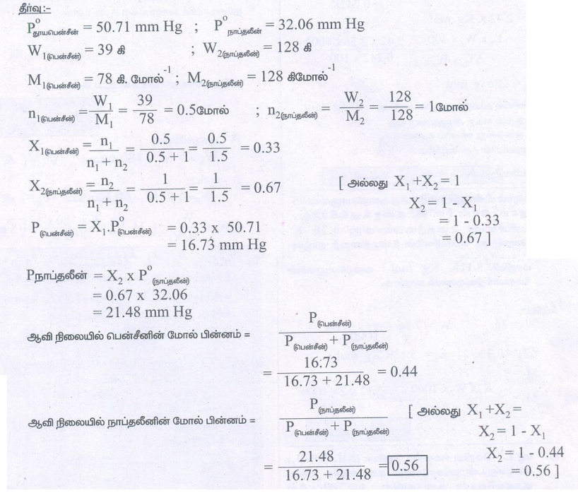 9. 128 கிராம் நாஃப்தலினை 39 கிராம் பென்சீனுடன் சேர்த்து, நல்லியல்பு திரவக் கரைசலை உருவாக்கும்போது, ஆவிநிலையிலுள்ள பென்சீன் மற்றும் நாஃப்தலீனின் மோல் பின்னங்களை கணக்கிடுக. 300 K வெப்பநிலையில், தூய பென்சீனின் ஆவிஅழுத்தம் 50.71 mmHg மற்றும் தூய நாஃப்தலீனின் ஆவிஅழுத்தம் 32.06 mmHg