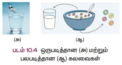 ஒருபடித்தான கலவையில் அதன் பகுதிப்பொருட்களை தனித்தனியாகப் பார்க்க இயலாது. இக்கலவையில் பகுதிப்பொருட்கள் சீராகக் கலந்து ஒத்த பண்புகளைப் பெற்றிருக்கும். குழாய் நீர், பால், காற்று, பனிக்கூழ், சர்க்க ரைப் பாகு, மை, எஃகு, வெண்க லம் மற்றும் உப்பு நீர்(படம் 10.4 அ) போன்றவை ஒருபடித்தான கலவைகள் ஆகும்.
