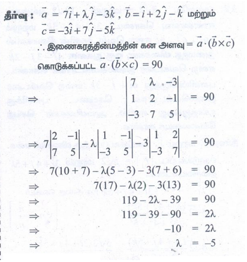 என்ற வெக்டர்களை ஒரு புள்ளியில் சந்திக்கும் விளிம்புகளாகக் கொண்ட இணைகரத் திண்மத்தின் கன அளவு 90 கன அலகுகள் எனில், λ –ன் மதிப்பைக் காண்க.