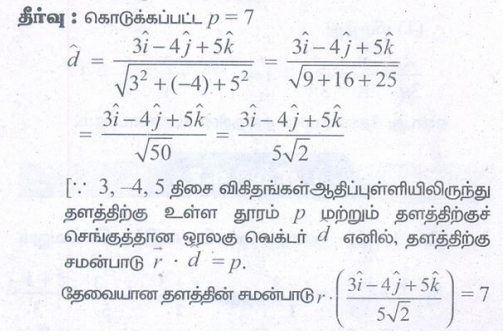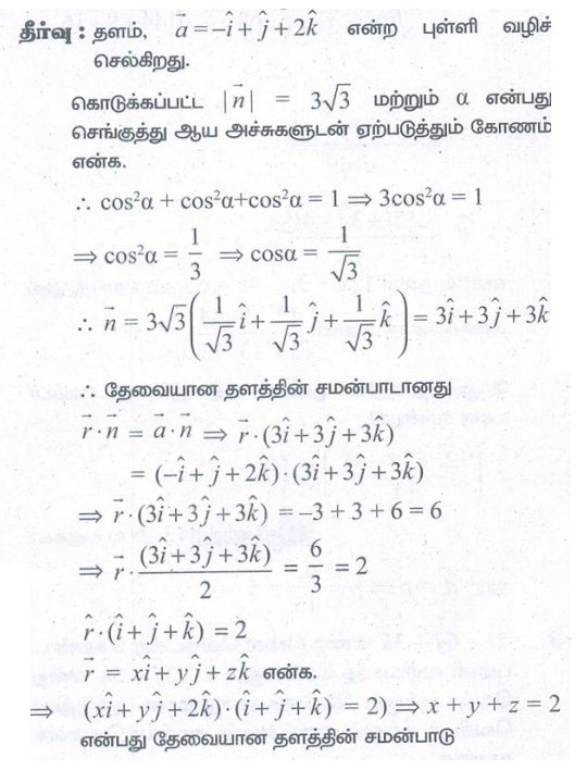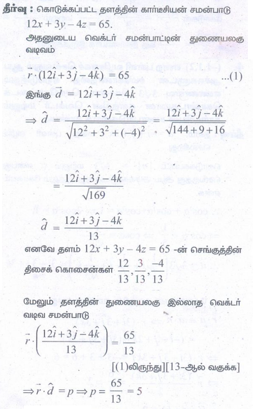 2. 12x+3y−4z =65 என்ற தளத்தின் செங்குத்தின் திசைக்கொசைன்களைக் காண்க. மேலும், தளத்தின் துணையலகு அல்லாத வெக்டர் சமன்பாடு மற்றும் ஆதியில் இருந்து தளத்திற்கு வரையப்படும் செங்குத்தின் நீளம் காண்க.