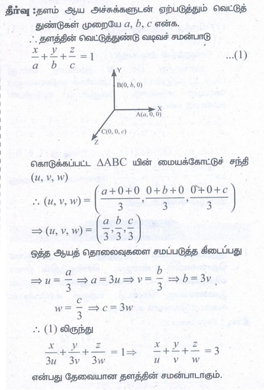 6. ஒரு தளம் ஆய அச்சுக்களை முறையே A, B, C என்ற புள்ளிகளில் வெட்டுவதால் உருவாகும் முக்கோணம் ABC –ன் மையக் கோட்டுச் சந்தி (u,v,w) எனில், தளத்தின் சமன்பாட்டைக் காண்க.