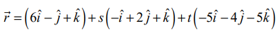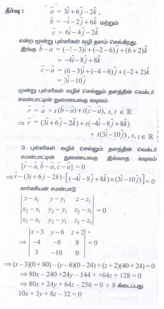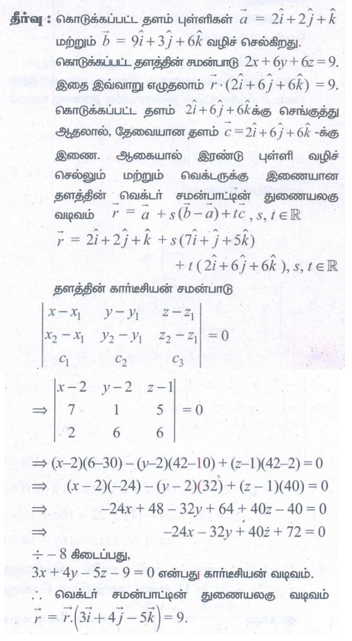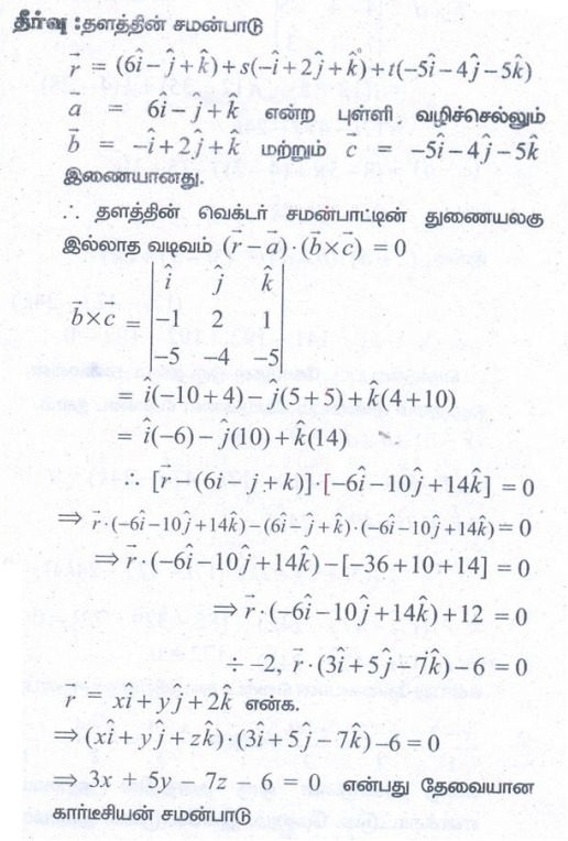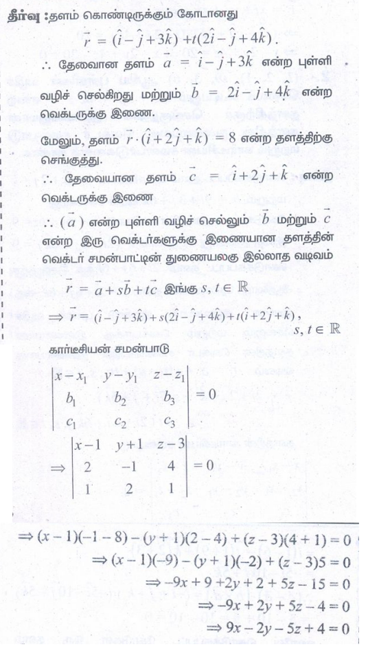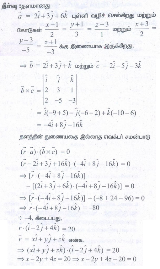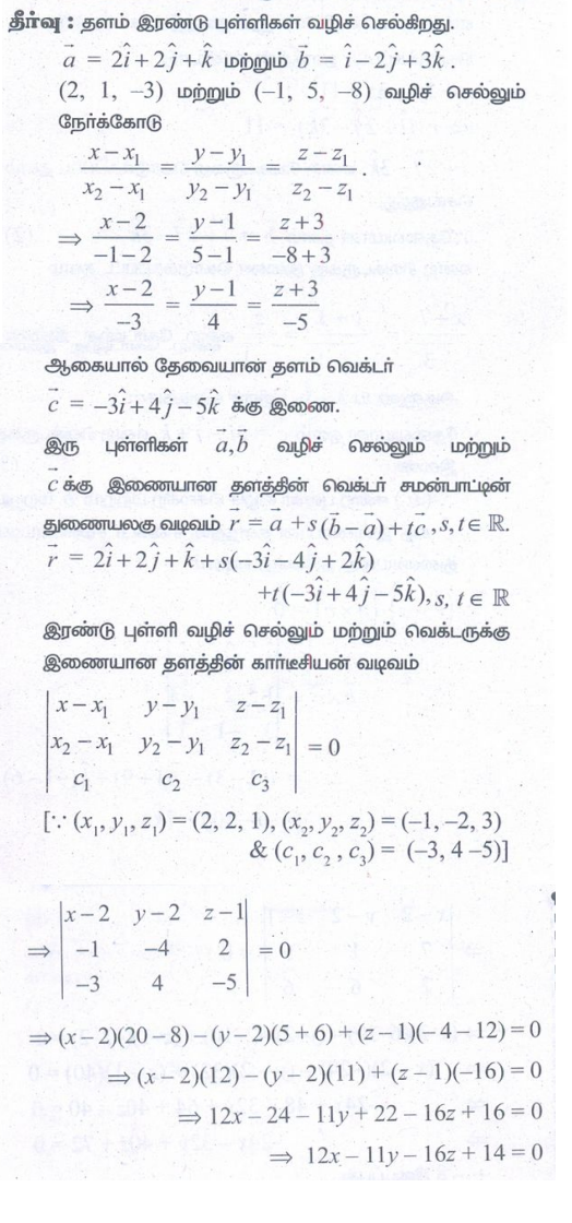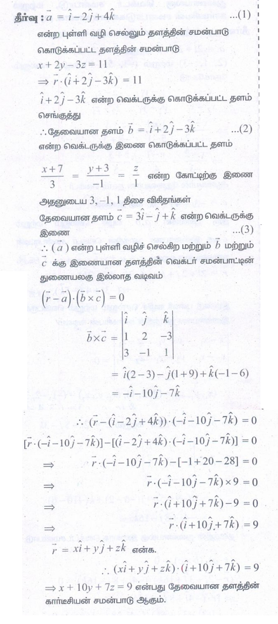 3. (2,2,1), (1,−2,3) என்ற புள்ளிகள் வழிச் செல்வதும் (2,1,−3) மற்றும் (−1,5,−8) என்ற புள்ளிகள் வழிச் செல்லும் நேர்க்கோட்டிற்கு இணையாகவும் அமையும் தளத்தின் துணையலகு வெக்டர் சமன்பாடு, மற்றும் கார்டீசியன் சமன்பாடுகளைக் காண்க.