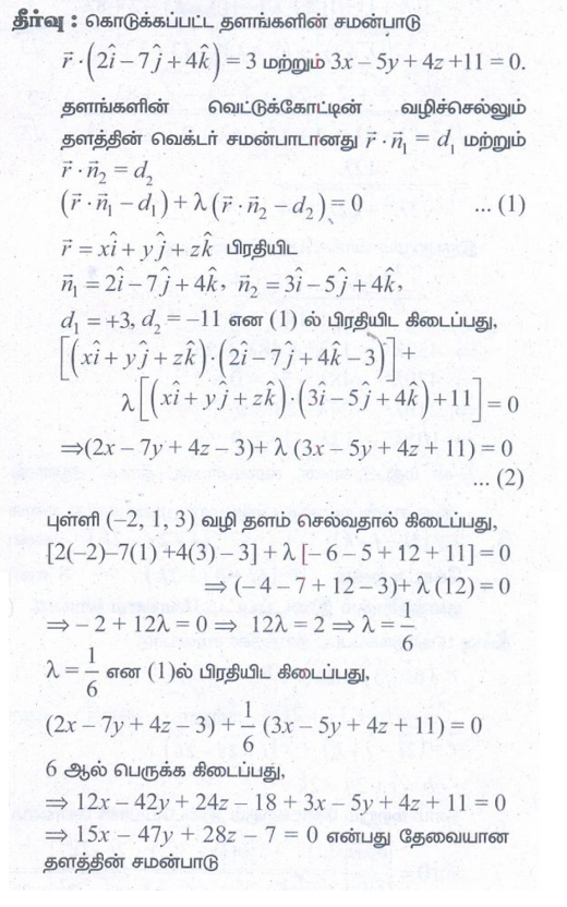 5. (3,4,−1) என்ற புள்ளி வழிச் செல்வதும் 2x−3y+5z+7= 0 என்ற தளத்திற்கு இணையானதுமான தளத்தின் சமன்பாட்டைக் காண்க. மேலும், இவ்விரு தளங்களுக்கு இடைப்பட்ட தொலைவினைக் காண்க.