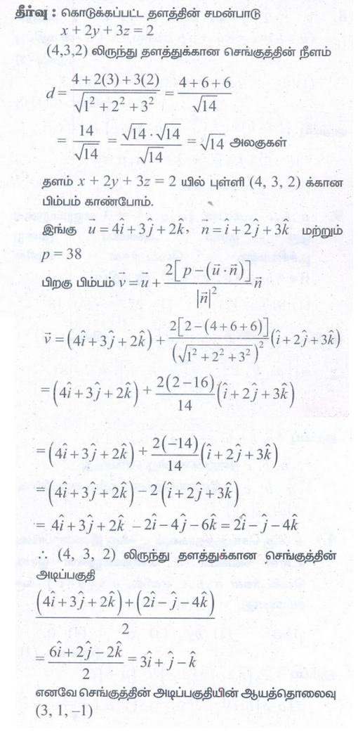 8. (4,3,2) என்ற புள்ளியில் இருந்து x+2y+3z=2 என்ற தளத்திற்கு வரையப்படும் செங்குத்தின் அடியின் அச்சுத் தூரங்களையும், செங்குத்தின் நீளத்தையும் காண்க.