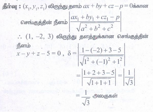 6. (1,−2,3) என்ற புள்ளியிலிருந்து x−y+z=5 என்ற தளத்திற்கு வரையப்பட்ட செங்குத்தின் நீளம் காண்க.