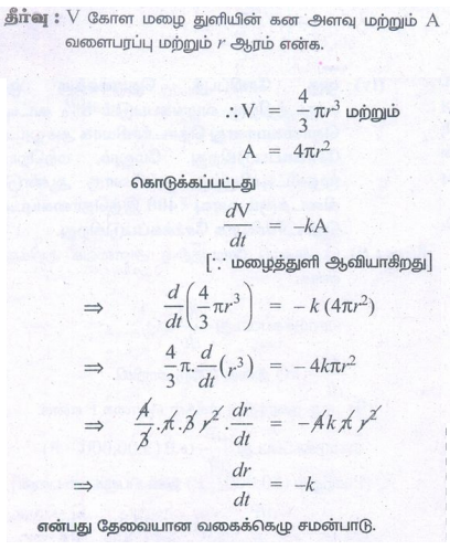 2. ஒரு கோள வடிவ மழைத்துளியானது அதன் வளைபரப்பின் மாறுவீதத்திற்கு நேர்விகிதத்தில்ஆவியாகிறது. மழைத்துளியின் ஆரத்தின் மாறுவீதத்தை உள்ளடக்கிய வகைக்கெழுச் சமன்பாட்டை உருவாக்குக.