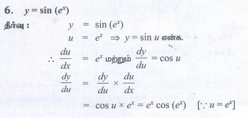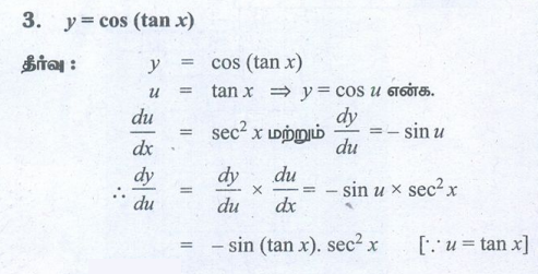 11 வது கணக்கு : அலகு 10 : வகை நுண்கணிதம் வகைமை மற்றும் வகையிடல் முறைகள் DIFFERENTIABILITY AND METHODS OF DIFFERENTIATION : பயிற்சி 10.3: சார்பின் சார்பினது வகைக்கெழு (இணைப்பு விதி) எடுத்துக்காட்டுகள் - புத்தக கணக்குகளுக்கான பதில்கள், தீர்வுகள் | கணக்கு : 11 ஆம் வகுப்பு