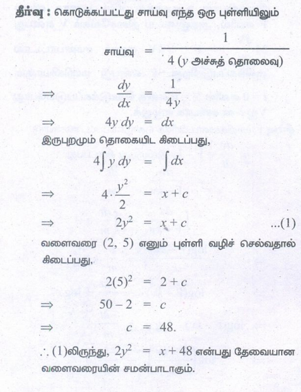 3. ஏதேனும் ஒரு புள்ளியில் ஒரு வளைவரையின் தொடுகோட்டின் சாய்வு, அப்புள்ளியின் yஅச்சுத் தொலைவின் 4மடங்கின் தலைகீழியாகும். மேலும் வளைவரை (2,5) எனும் புள்ளிவழியாகச் செல்கிறது எனில், வளைவரையின் சமன்பாட்டைக் காண்க.