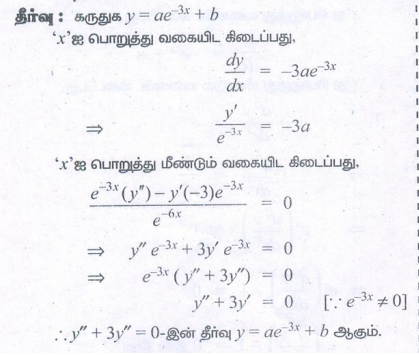 6. y = ae−3x + b என்பது d2y/dx2 + 3(dy/dx) = 0 எனும் வகைக்கெழுச் சமன்பாட்டின் தீர்வாகும் எனக்காட்டுக. இங்கு a, b ஏதேனும் இரு எதேச்சை மாறிலிகள்.