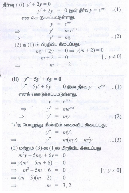 2. y = emx எனும் சார்பு கொடுக்கப்பட்ட வகைக்கெழுச் சமன்பாட்டிற்கு தீர்வாக அமையுமாறுm -ன் மதிப்புகளைக் காண்க.