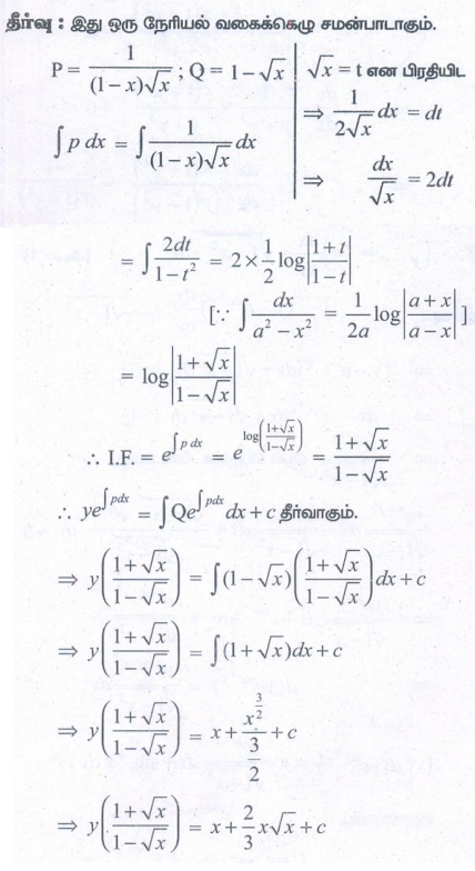 கணக்கு புத்தக பயிற்சி வினாக்கள் மற்றும் தீர்வுகள் - கணிதவியல் : சாதாரண வகைக்கெழுச் சமன்பாடுகள் : முதல் வரிசை நேரியல் வகைக்கெழுச் சமன்பாடுகள் (First Order Linear Differential Equations) : சோதனை வினாக்களுக்கான கேள்வி பதில், தீர்வுகள்