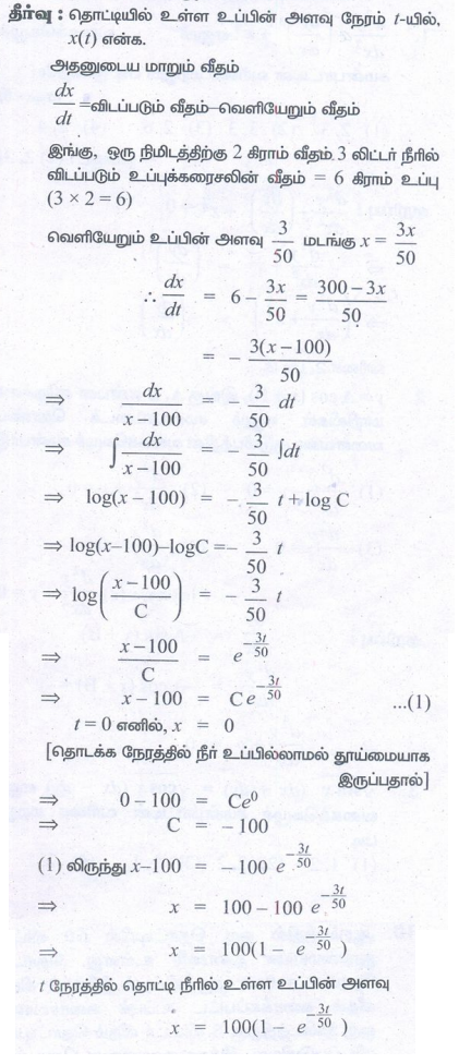 10. ஆரம்பத்தில் ஒரு தொட்டியில் 50 லிட்டர் தூய்மையான தண்ணீர் உள்ளது. தொடக்க நேரம் t = 0 -ல் ஒரு லிட்டர் ஒரு லிட்டர் நீரில் 2 கிராம் வீதம் கரைக்கப்பட்ட உப்புக் கரைசலானது ஒரு நிமிடத்திற்கு 3 லிட்டர் வீதம் தொட்டியில் விடப்படுகிறது. இக்கலவையானது தொடர்ந்து கலக்கப்பட்டு சீராக வைக்கப்படுகிறது. மேலும், அதே நேரத்தில் நன்கு கலக்கப்பட்ட இக்கலவையானது அதே வீதத்தில் தொட்டியிலிருந்து வெளியேறுகிறது. t > 0 எனும் ஏதேனும் ஒரு நேரத்தில் தொட்டியில் உள்ள உப்பின் அளவினைக் காண்க.