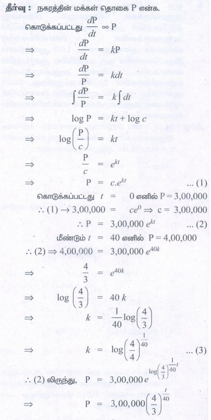 2. ஒரு நகரத்தின் மக்கள் தொகை வளர்ச்சி வீதம் t நேரத்தில் உள்ள மக்கள் தொகையின் விகிதமாக அமைந்துள்ளது. மேலும் நகரத்தின் மக்கள் தொகை 40 ஆண்டுகளில் 3,00,000லிருந்து 4,00,000 ஆக அதிகரித்துள்ளது எனக் கொடுக்கப்பட்டுள்ளது எனில், t நேரத்தில் அந்நகரத்தின் மக்கள் தொகையைக் காண்க.