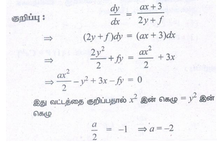 24. dy/dx = (ax+3/2y+f) எனும் வகைக்கெழுச் சமன்பாட்டின் தீர்வு ஒரு வட்டத்தைக் குறிக்குமானால்,a-ன் மதிப்பு