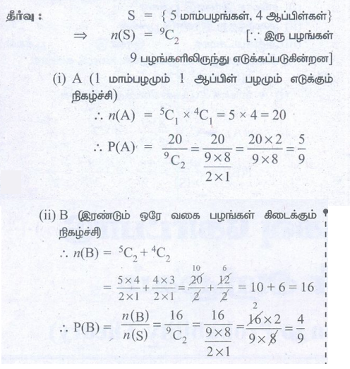 (3) ஒரு பெட்டியில் 5 மாம்பழங்களும் 4 ஆப்பிள் பழங்களும் உள்ளன. சமவாய்ப்பு முறையில் இரண்டு பழங்கள் எடுக்கப்பட்டால்