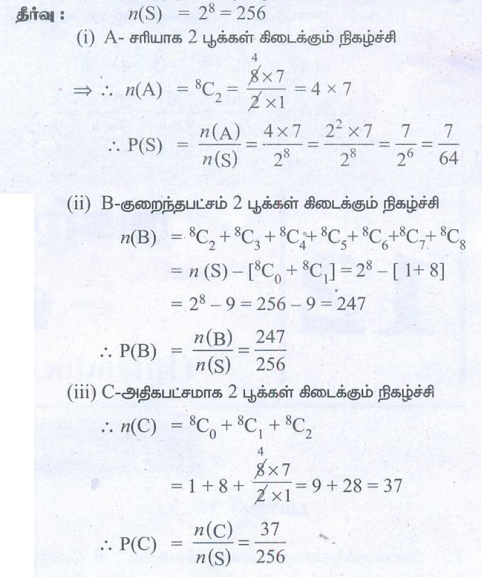 (5) எட்டு நாணயங்கள் ஒரு முறை சுண்டப்படுகின்றன. (i) சரியாக இரண்டு பூக்கள். (ii) குறைந்தபட்சம் இரண்டு பூக்கள் (iii) அதிகபட்சமாக இரண்டு பூக்கள் கிடைப்பதற்கான நிகழ்தகவுகளைக் காண்க.