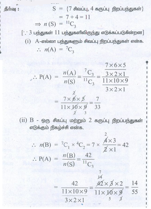 (7) ஒரு பையில் 7 சிவப்பு மற்றும் 4 கருப்பு நிறப் பந்துகளும் உள்ளன. 3 பந்துகள் சமவாய்ப்பு முறையில் எடுக்கப்பட்டால்