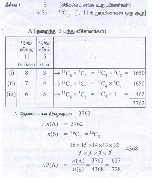 (8) ஒரு கிரிக்கெட் சங்கத்தில் 16 உறுப்பினர்கள் உள்ளனர். அவர்களின் 5 பேர் மட்டுமே பந்து விசும் திறம் படைத்தவர்கள். இவர்களுள் 11 பேர் கொண்ட ஒரு குழுவில் குறைந்தது 3 பந்து விச்சாளர்களாவது இடம் பெறுவதற்கான நிகழ்தகவு காண்க.