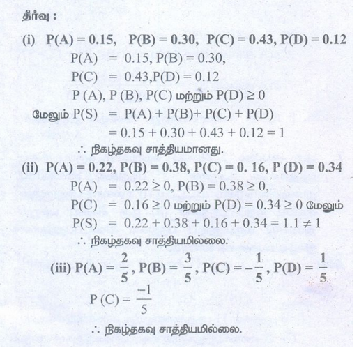 (1) பின்வரும் ஒன்றையொன்று விலக்கிய A, B, C மற்றும் D என்ற நான்கு நிகழ்ச்சிகளை மட்டும் கொண்ட ஒரு சோதனையின் நிகழ்ச்சிகளின் நிகழ்தகவுகள் சாத்தியமானவையா எனத் தீர்மானிக்கவும்.