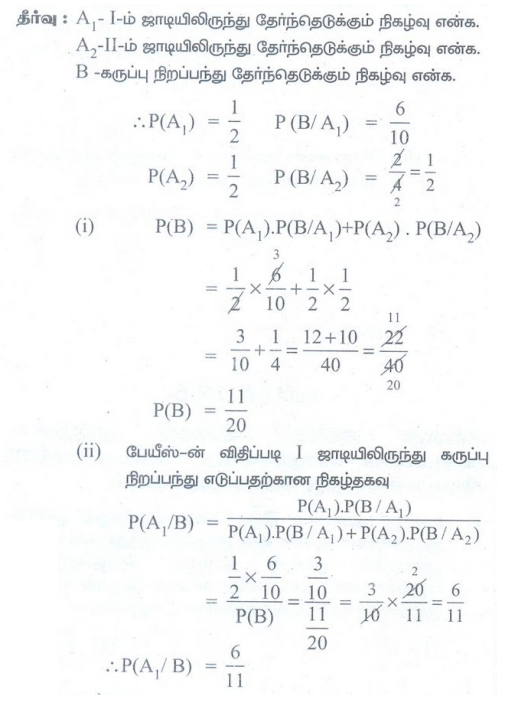 (2) ஒத்த இரு ஜாடிகளில், ஒன்றில் 6 கருப்பு மற்றும் 4 சிவப்பு நிறப்பந்துகள் உள்ளன. மற்றொரு ஜாடியில் 2 கருப்பு மற்றும் 2 சிவப்பு நிறப்பந்துகள் உள்ளன. சமவாய்ப்பு முறையில் ஒரு ஜாடி தேர்ந்தெடுக்கப்பட்டு அதிலிருந்து ஒரு பந்து எடுக்கப்படுகிறது.