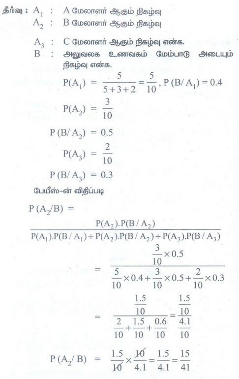 (4) ஒரு குறிப்பிட்ட நிறுவனத்தில் A, B மற்றும் C ஆகியோர் மேலாளர் ஆவதற்கான வாய்ப்புகள் முறையே 5 : 3 :2 என்ற விகிதத்தில் உள்ளனர். A, B மற்றும் C ஆகியோர் மேலாளர்களாக இருந்தால் அலுவலக உணவகத்தினை மேம்படுத்துவதற்கான நிகழ்தகவுகள் முறையே 0.4, 0.5 மற்றும் 0.3 ஆகும். அலுவலக உணவகம் மேம்பட வேண்டுமெனில் B என்பவரை மேலாளராக நியமிப்பதற்கான நிகழ்தகவு என்ன?