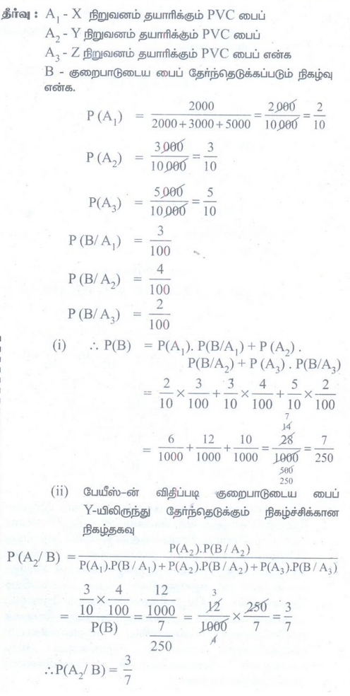 (3) ஒரு PVC பைப் தயாரிக்கும் நிறுவனம் X, Y மற்றும் Z என்ற மூன்று தொழிற்சாலைகள் மூலம் உற்பத்தி செய்கிறது. X, Y மற்றும் Z களின் தினந்தோறும் உற்பத்தி செய்யும் பைப்களின் அளவுகள் முறையே 2000 அலகுகள், 3000 அலகுகள் மற்றும் 5000 அலகுகள் ஆகும். முந்தைய திறனைப் பொறுத்து X, Y மற்றும் Z தொழிற்சாலைகளில் உற்பத்தியாகும் பைப்களின் குறைபாடுகள் முறையே 3%, 4% மற்றும் 2% ஆகும். சமவாய்ப்பு முறையில் ஒரு நாள் உற்பத்தியான பைப்களிலிருந்து ஒரு பைப் தேர்ந்தெடுக்கப் படுகிறது.