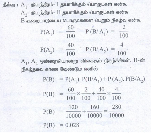 (1) ஒரு தொழிற்சாலையில் இயந்திரங்கள் I மற்றும் II என இருவகை உள்ளன. இயந்திரம்-I தொழிற்சாலையின் உற்பத்தியில் 60% தயாரிக்கிறது மற்றும் இயந்திரம்-II உற்பத்தியில் 40% தயாரிக்கிறது. மேலும் இயந்திரம்-I -ன் மூலம் உற்பத்தி செய்யப்பட்ட பொருட்களில் 2% குறைபாடுள்ளதாகவும் இயந்திரம்-II-ன் மூலம் உற்பத்தி செய்யப்பட்ட பொருட்களில் 4% குறைபாடு உள்ளதாகவும் இருக்கின்றன. உற்பத்தி செய்யப்பட்ட பொருட்களிலிருந்து, சமவாய்ப்பு முறையில் ஒரு பொருள் தேர்ந்தெடுக்கப்படுகிறது. அப்பொருள் குறைபாடுடன் இருப்பதற்கான நிகழ்தகவு யாது?