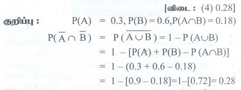(24) A மற்றும் Bஎன்ற இரு நிகழ்ச்சிகள் நிகழ்வதற்கான நிகழ்தகவு முறையே 0.3 மற்றும் 0.6 ஆகும். A மற்றும் Bஒரே சமயத்தில் நிகழ்வதற்கான நிகழ்தகவு 0.18 எனில் A அல்லது Bநிகழாமல் இருப்பதற்கான நிகழ்தகவு