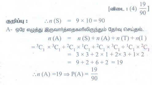 (8) ‘ASSISTANT' என்ற சொல்லிலிருந்து சமவாய்ப்பு முறையில் ஒரு எழுத்தும் ‘STATISTICS’. என்ற சொல்லிலிருந்து சமவாய்ப்பில் ஒரு எழுத்தும் தேர்ந்தெடுக்கப்படும்பொழுது அவ்விரு எழுத்துக்களும் ஒரே எழுத்தாக இருப்பதற்கான நிகழ்தகவானது