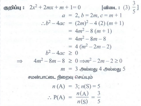 (20) a மற்றும் b-ன் மதிப்புகள் {1,2,3,4} என்ற கணத்தில் திரும்பத் திரும்ப வரும் என்ற வகையில் சமவாய்ப்பு முறையில் தேர்ந்தெடுக்கப்பட்டால் x2 + ax + b= 0 என்ற சமன்பாட்டின் மூலங்கள் மெய்யெண்களாக இருப்பதற்கான நிகழ்தகவு