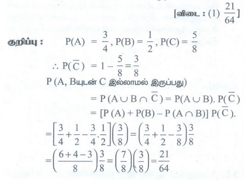 (3) A, B, மற்றும் C தனித்தனியாக ஒரே சமயத்தில் ஒரு இலக்கை நோக்கிச் சுடுகின்றனர். அவர்கள் அந்த இலக்கைச் சுடுவதற்கான நிகழ்தகவுகள் முறையே 3/4, 1/2, 5/8 எனில் A அல்லது B அந்த இலக்கைச் சரியாகச் சுடவும் ஆனால் அந்த இலக்கை C சரியாகச் சுடாமல் இருப்பதற்கான நிகழ்தகவானது