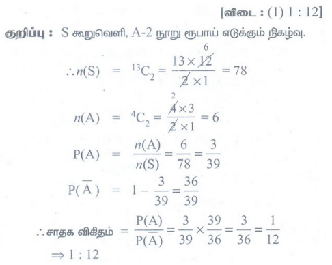 (7) ஒரு நபரின் கைப்பையில் 3 ஐம்பது ரூபாய் நோட்டுகளும், 4 நூறு ரூபாய் நோட்டுகளும் மற்றும் 6 ஐநூறு ரூபாய் நோட்டுகளும் உள்ளன. அவற்றிலிருந்து எடுக்கப்படும் இரு நோட்டுகளும் நூறு ரூபாய் நோட்டுகளாகக் கிடைப்பதற்கான நிகழ்தகவின் சாதக விகிதமானது.