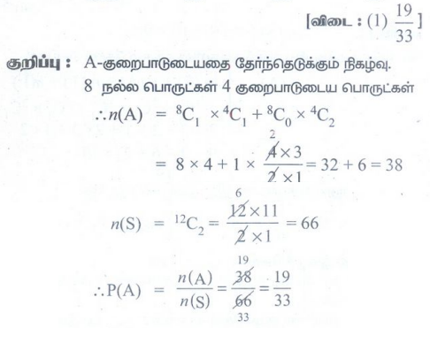 (6) நான்கு குறைபாடுள்ள பொருள்களைக் கொண்ட மொத்தம் 12 பொருள்களிலிருந்து இரு பொருள்களைத் தேர்ந்தெடுக்கும்போது அதில் குறைந்தது ஒரு பொருள் குறைபாடு உடையதாக இருப்பதற்கான நிகழ்தகவானது