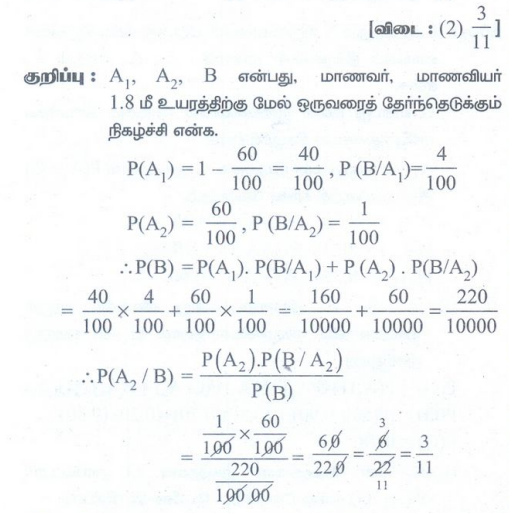 (22) ஒரு குறிப்பிட்ட கல்லூரியில் 4% மாணவர்கள் மற்றும் 1% மாணவியர்கள் 1.8 மீட்டர் உயரத்திற்கு மேல் உள்ளனர். மேலும் கல்லூரியில் மொத்த எண்ணிக்கையில் 60% மாணவியர்கள் உள்ளனர். சமவாய்ப்பு முறையில் 1.8 மீ உயரத்திற்கு மேல் ஒருவரைத் தேர்ந்தெடுக்கும்போது அவர் மாணவியாக இருப்பதற்கான நிகழ்தகவு