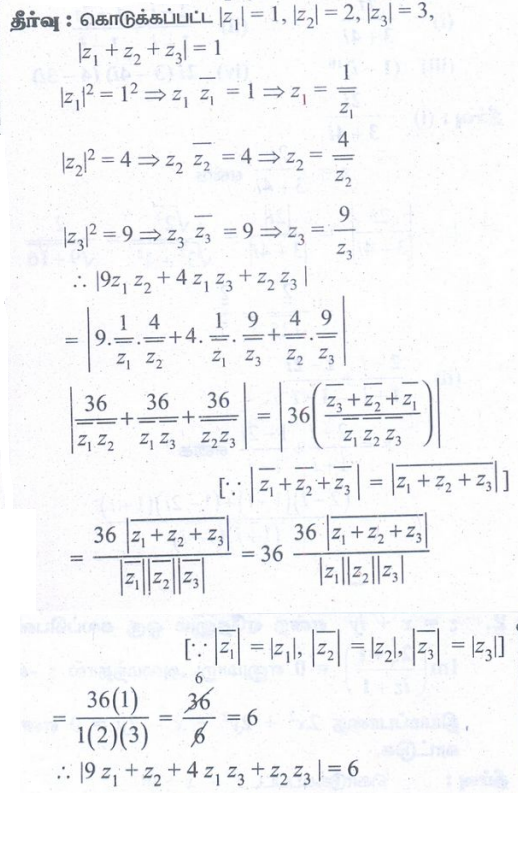7. z1, z2, மற்றும் z3 என்ற மூன்று கலப்பெண்கள் |z1| = 1, |z2| = 2, |z3| = 3, மற்றும் |z1 + z2 + z3| = 1 என்றவாறு உள்ளது எனில் |9z1 z2 + 4z1z3 + z2z3|= 6 என நிறுவுக.
