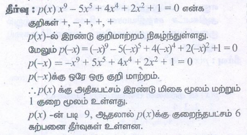 3. x9 − 5x5 + 4x4 + 2x2 + 1 = 0 என்ற சமன்பாட்டிற்கு குறைந்தபட்சம் 6 மெய்யற்ற கலப்பெண் தீர்வுகள் உண்டு எனக் காட்டுக.
