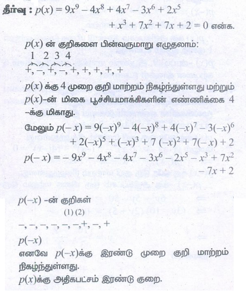 1. 9x9 − 4x8 + 4x7 −3x6 + 2x5 + x3 + 7x2 + 7x + 2 = 0 எனும் பல்லுறுப்புக்கோவை சமன்பாட்டின் அதிகபட்ச சாத்தியமான மிகை எண் மற்றும் குறையெண் மூலங்களின் எண்ணிக்கையை ஆராய்க