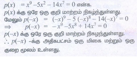 4. x9 − 5x8 − 14x7 = 0 எனும் பல்லுறுப்புக்கோவை சமன்பாட்டின் மிகையெண் மற்றும் குறையெண் மூலங்களின் எண்ணிக்கையை தீர்மானிக்க.