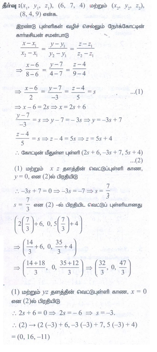 3. (6,7,4) மற்றும் (8,4,9) என்ற புள்ளிகள் வழியாகச் செல்லும் நேர்க்கோடு xz மற்றும் yz தளங்களை வெட்டும் புள்ளிகளைக் காண்க.