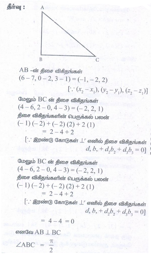 6. A(7,2,1), B(6,0,3), மற்றும் C(4,2,4) என்பன ∆ABC−ன் உச்சிகள் எனில், ∠ABC –ஐக் காண்க.